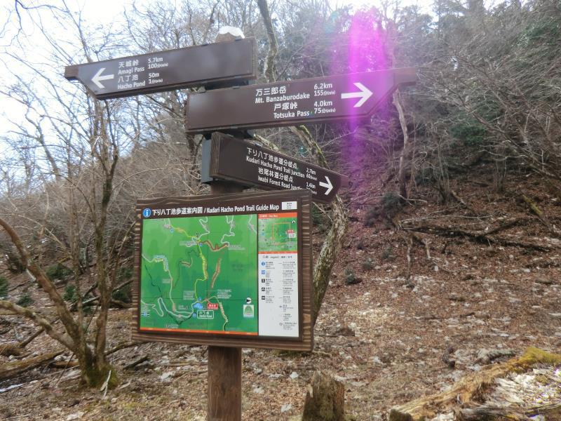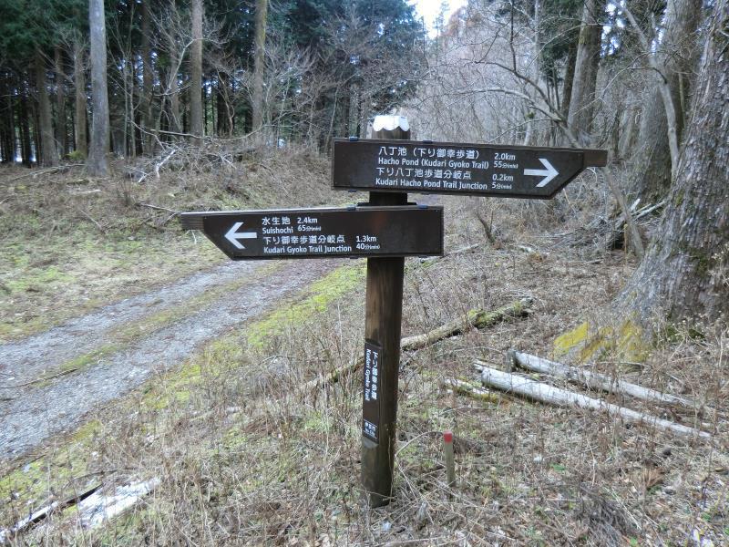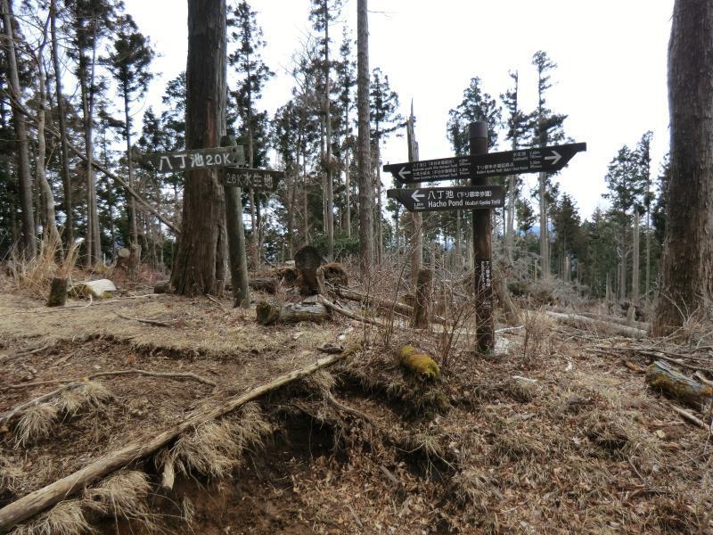 四差路で下り八丁池歩道分岐の看板と